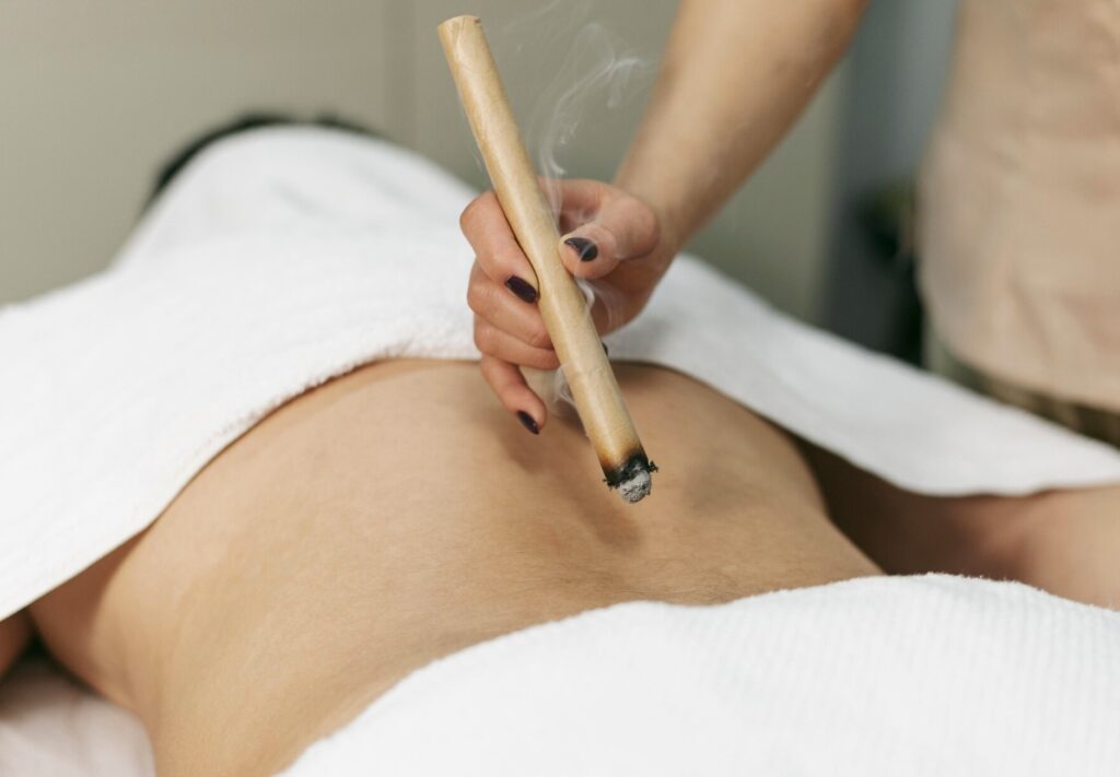 La moxibustión utiliza la calidez de la hierba artemisa, encendida suavemente cerca de la piel, para aplicar un calor profundo en puntos específicos del cuerpo.